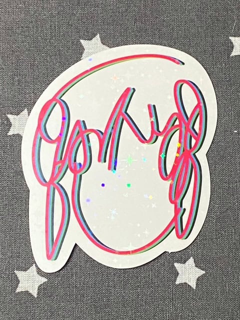 This is a vinyl sticker that has been laminated with glitter overlay for extra protection, so it’s good for your coffee cup, water bottle, phone case, or laptop. I make these myself at home in small batches. They can handle hand washings, but last longer when kept out of the dishwasher.