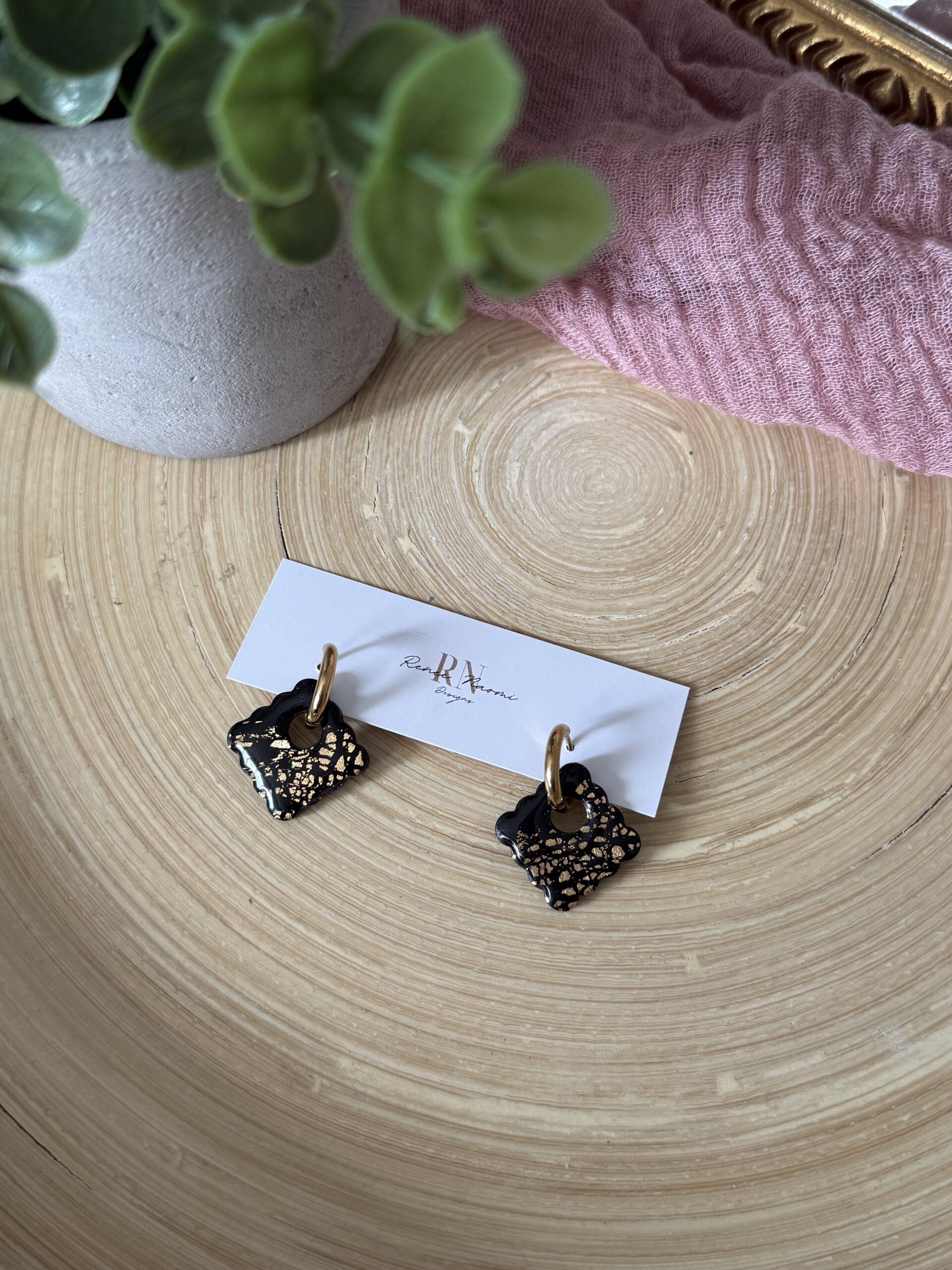 Black and gold scalloped charms on dainty gold hoops.
