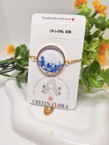 Half moon style blue queen annes flower bracelet, gold, stainless steel, adjustable