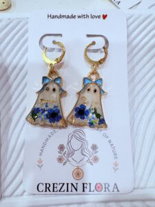 Real blue plum flowers pressed,cute ghost hoops earrings, stainless steel hoops