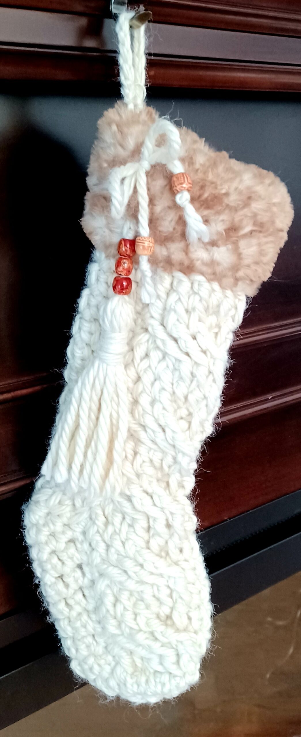 Crocheted Christmas Stocking with fur trim and bead tassle accent.