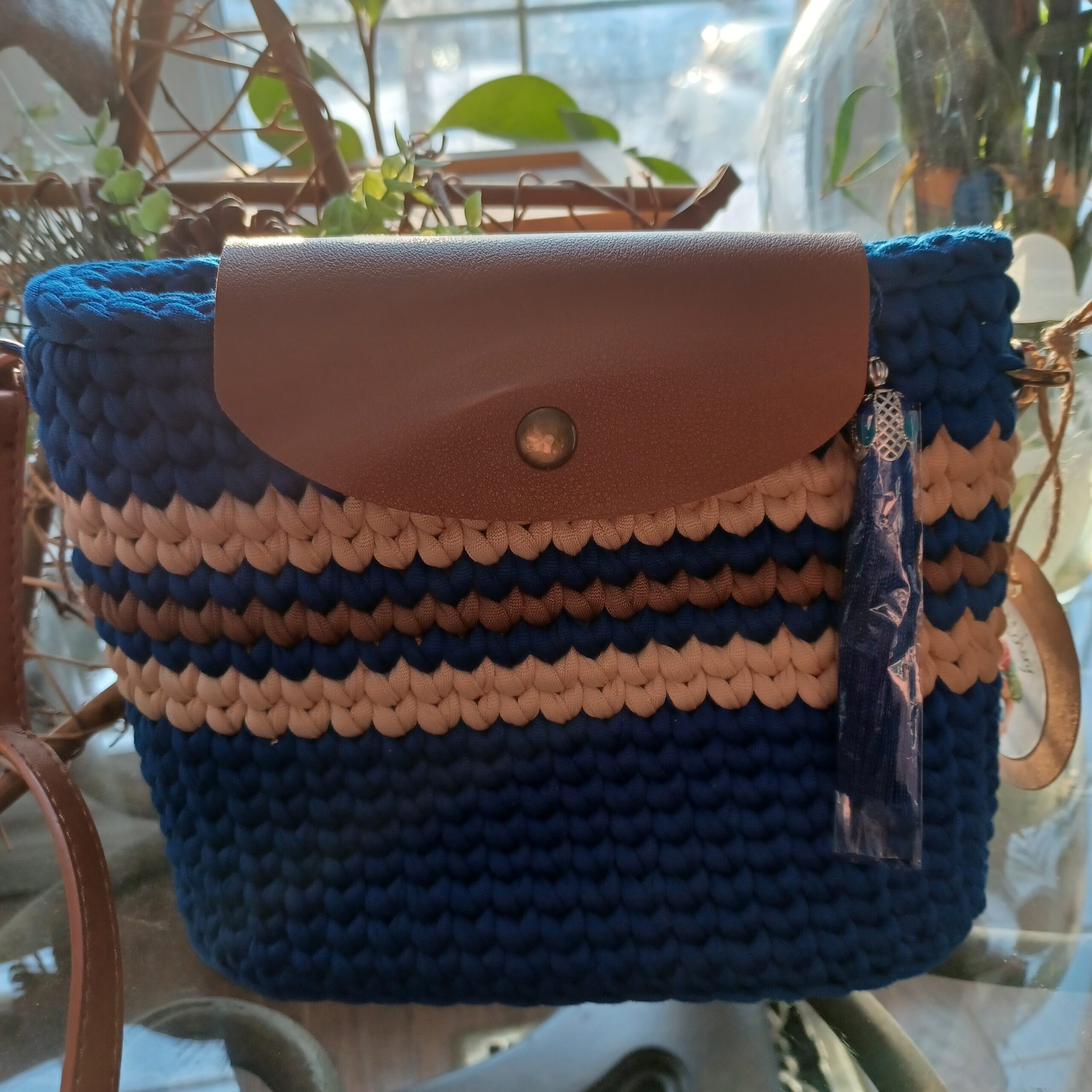 Crossbody bag crocheted from sturdy ribbon yarn.