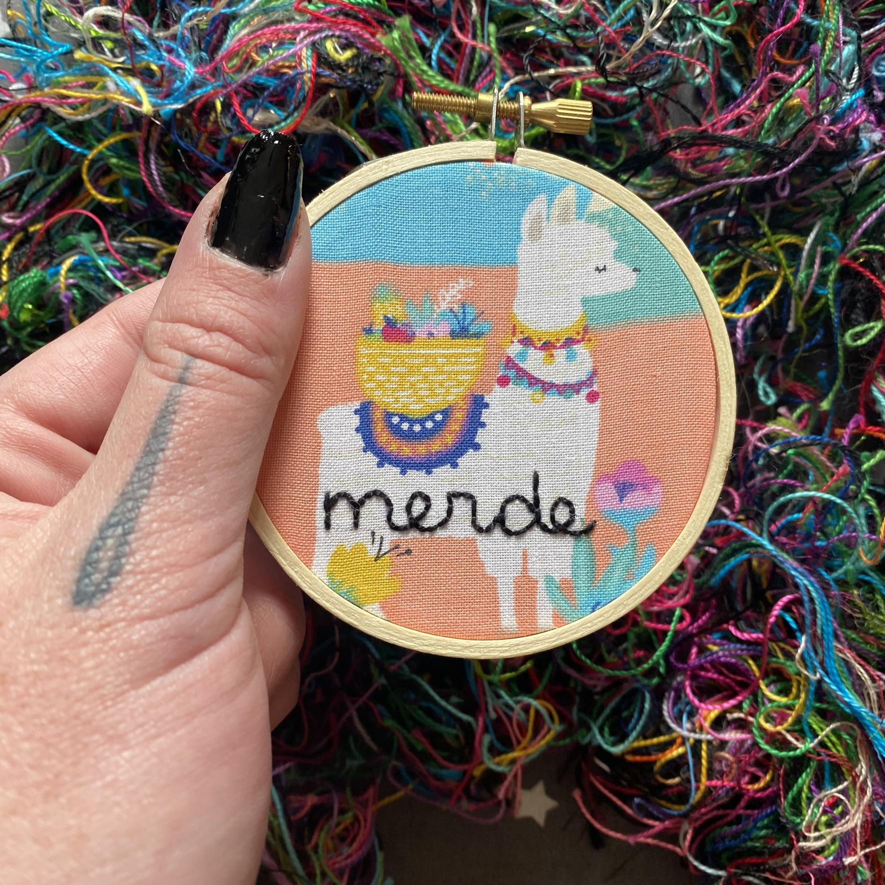 Drama Llama Curses in Cursive Merde 3″ Hand Embroidered Hoop Art