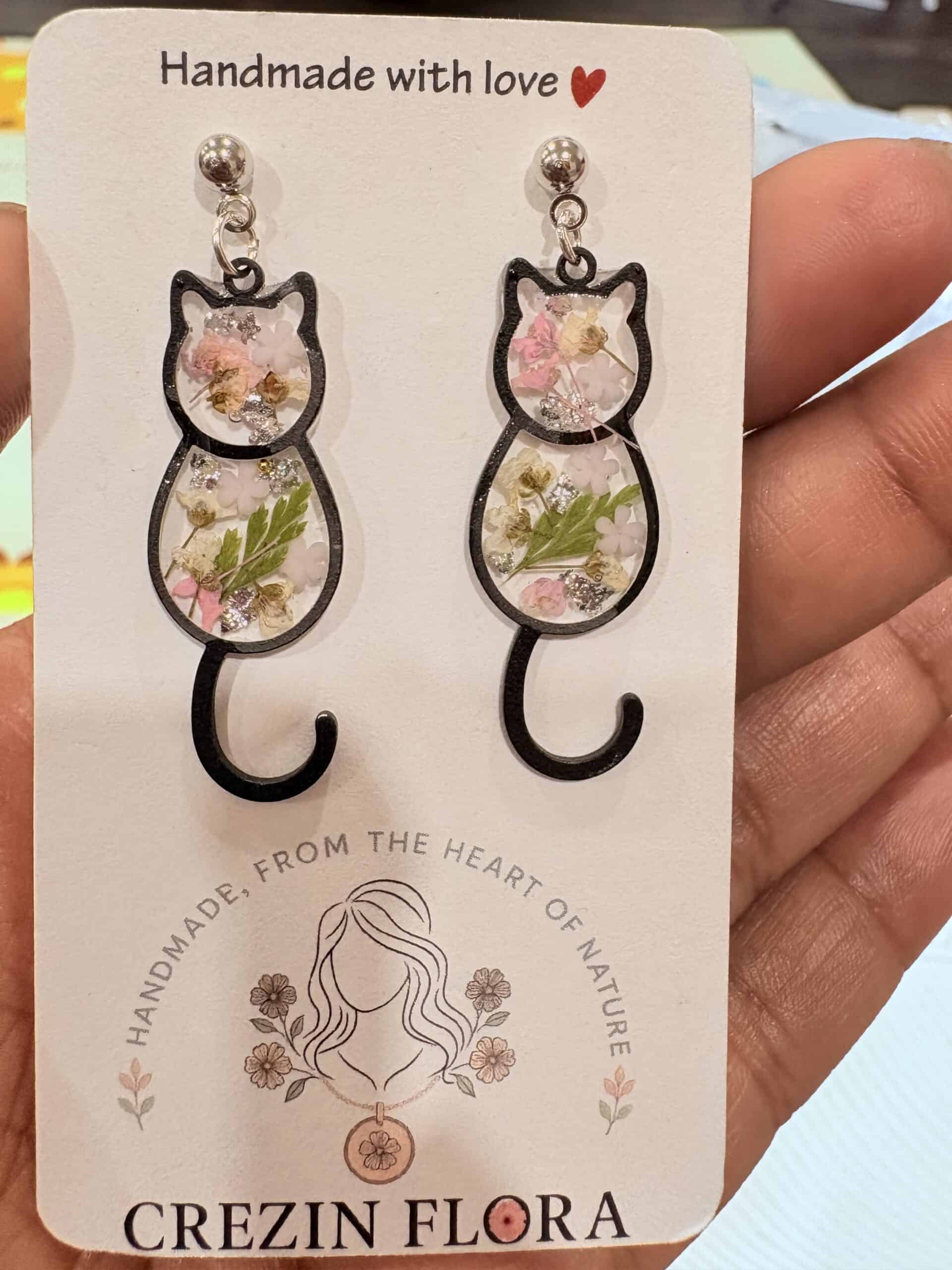 Real flowers pressed,cute cat hoops earrings, stainless steel hoops