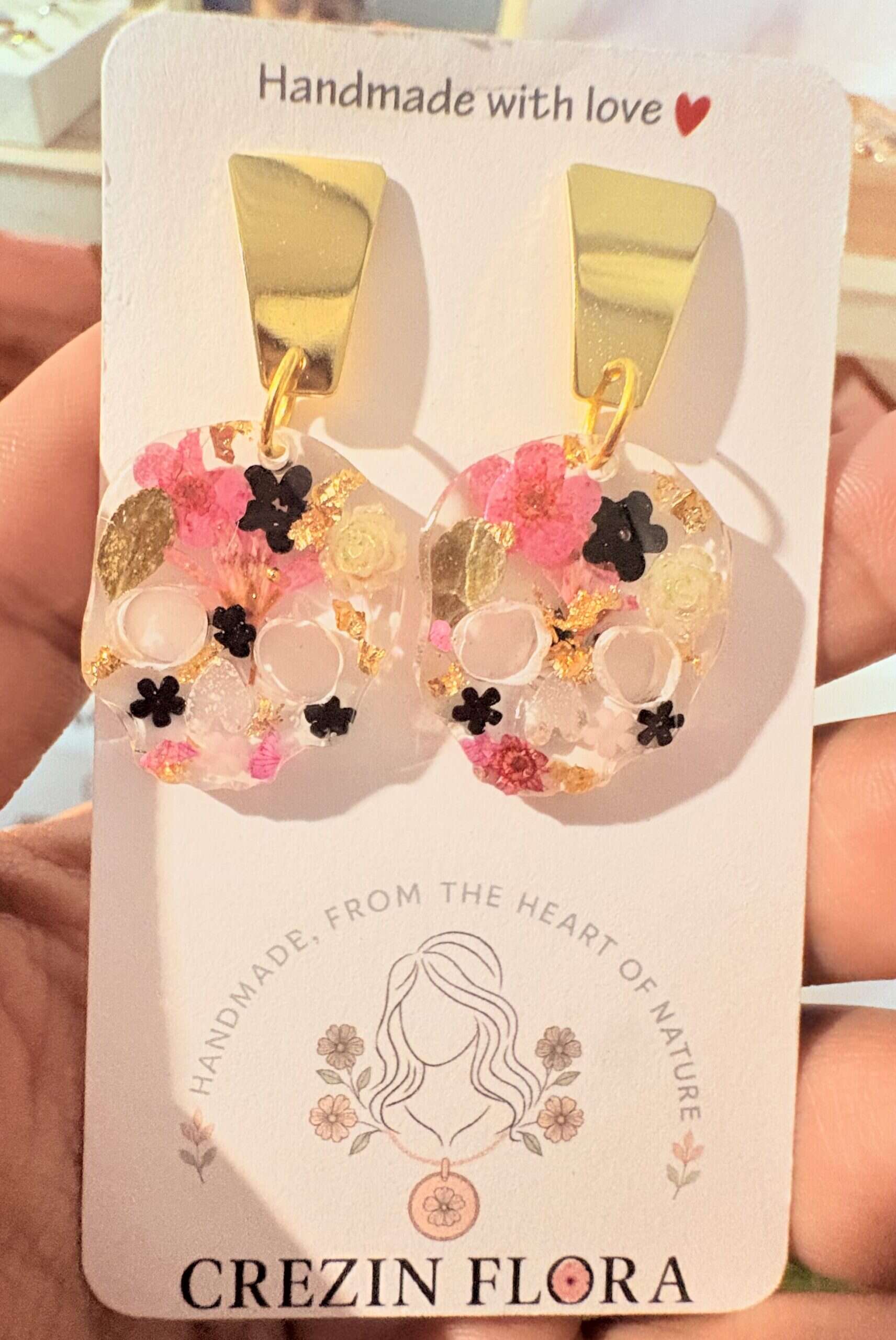 Real pressed flwer filled skull shaped earrings, stainless steel hoops