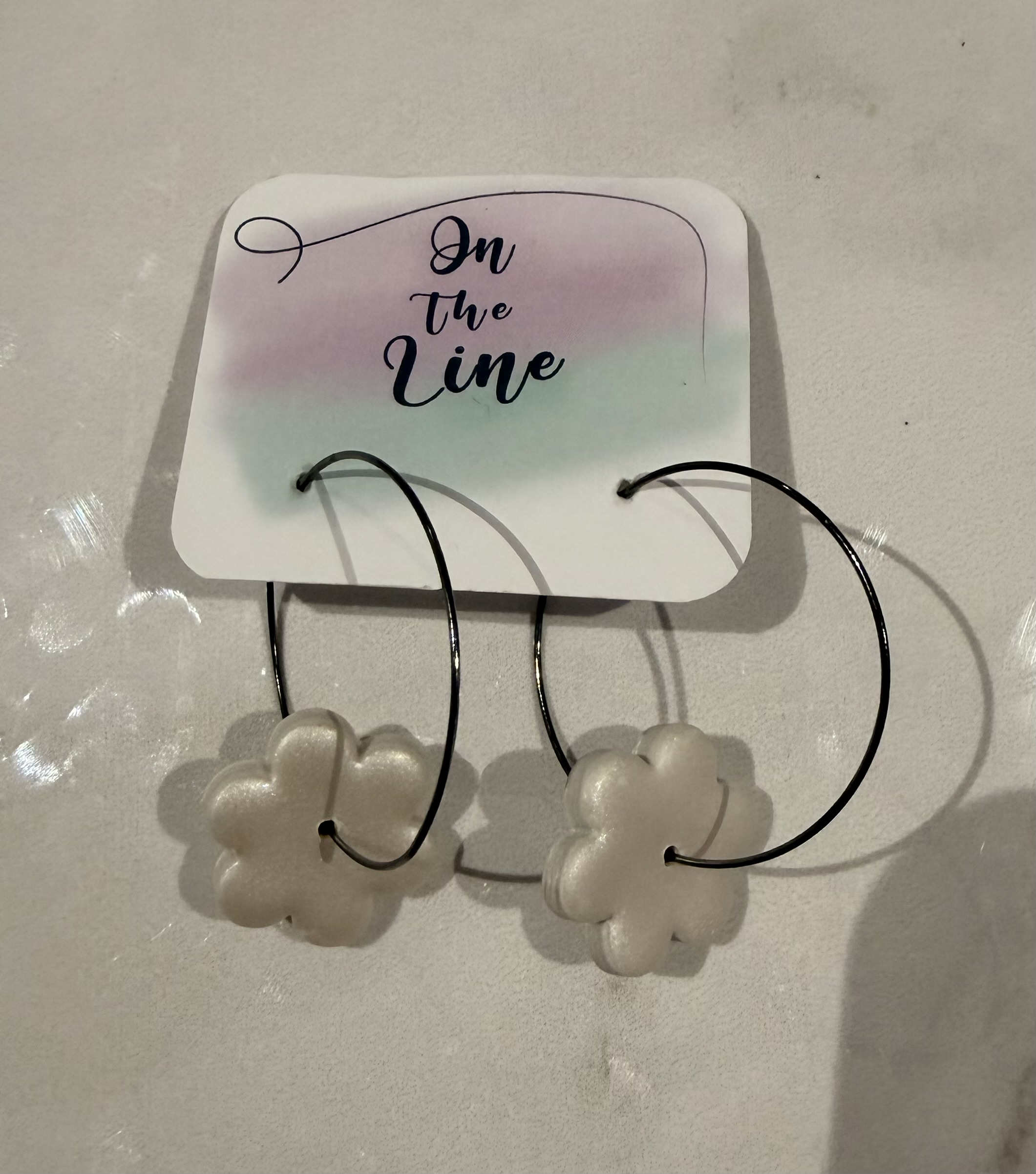 Flower drops in white on a simple hoop. These are a smaller option for a dangle style earring, lighter and simpler then the larger styles.