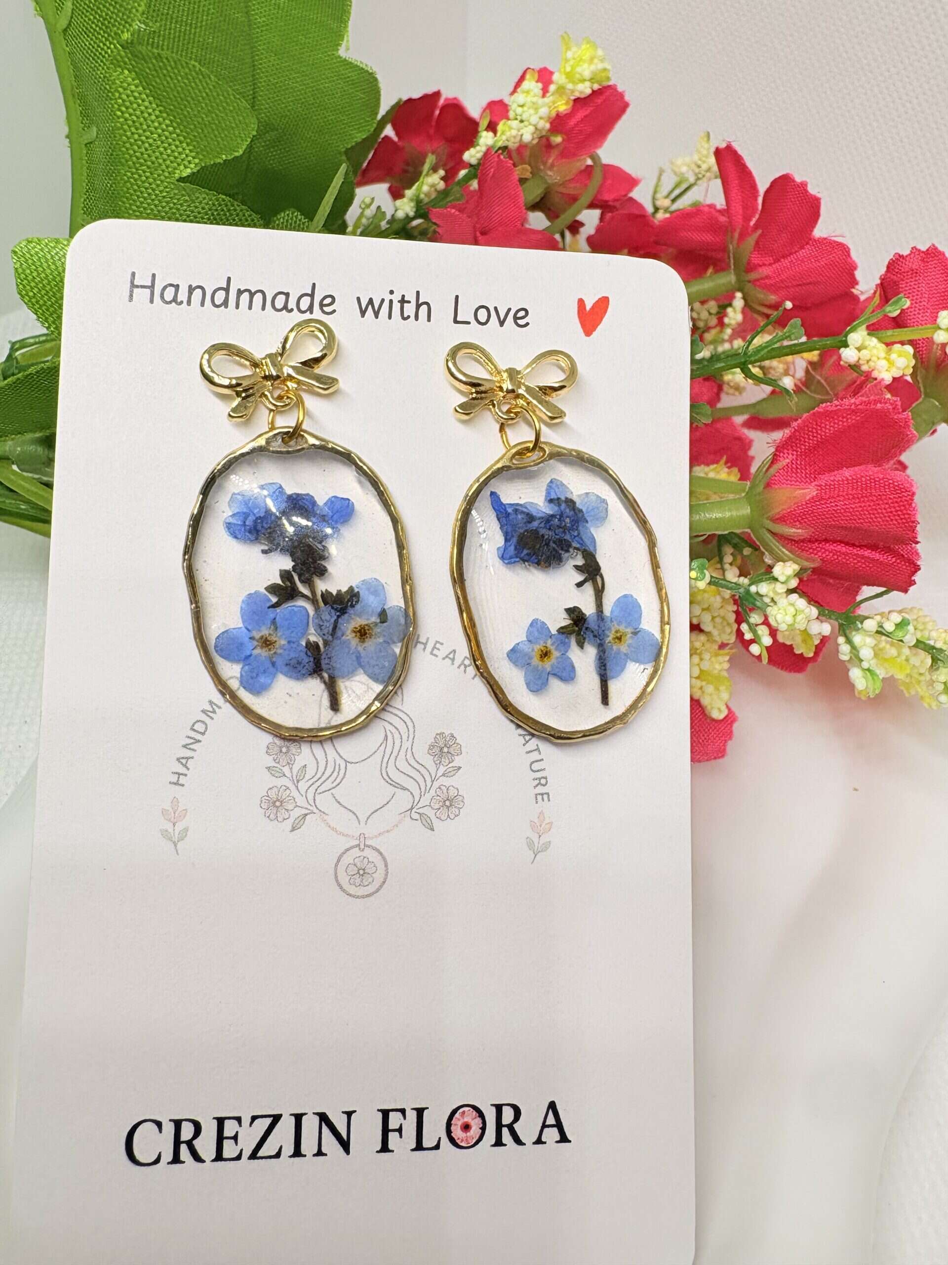 Forgot me not flowers pressed oval earrings with stainless steel post