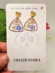 White,blue forgot me not flowers pressed, gold flakes filled earrings