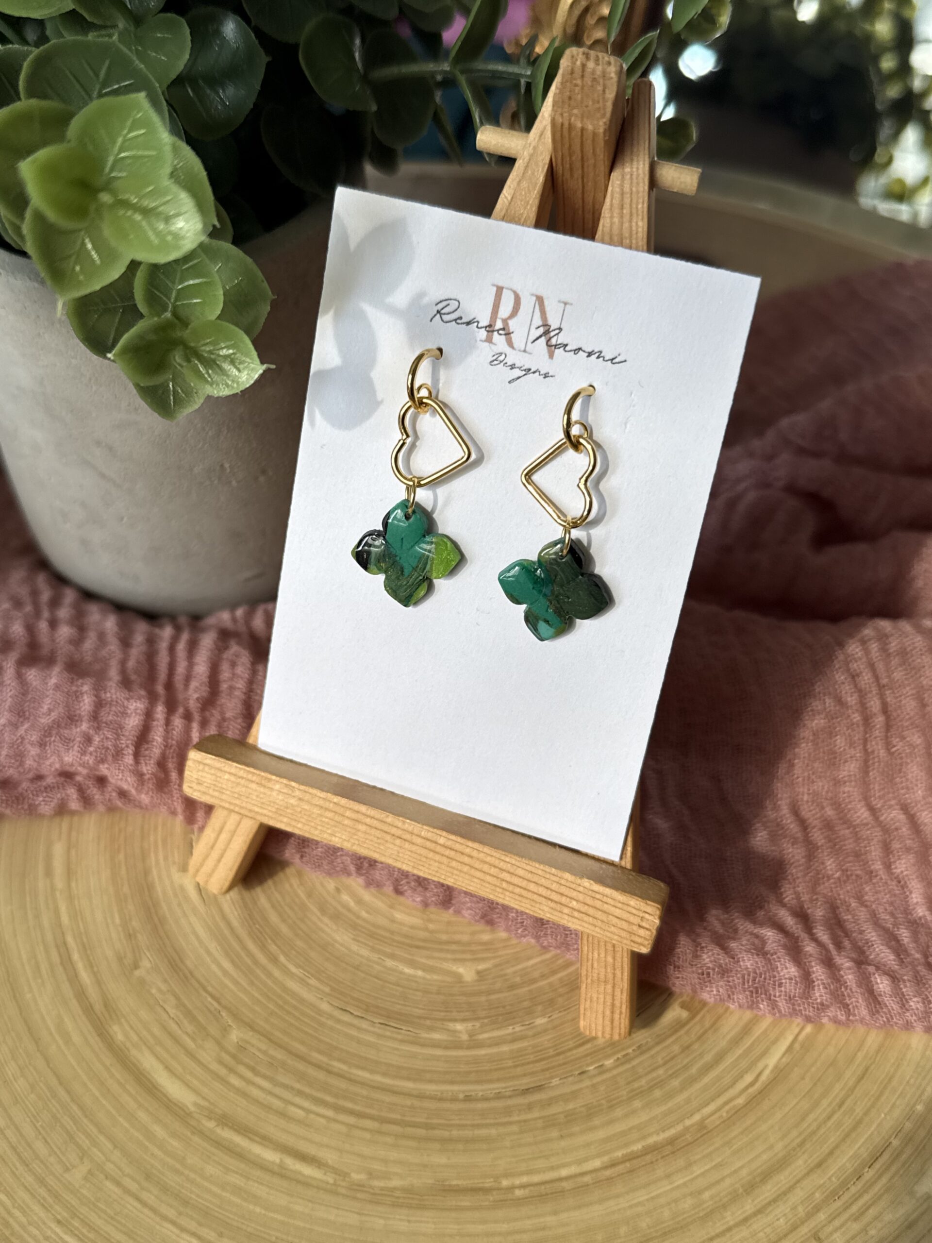 Mixed green clay flowers on a gold heart charm earrings.