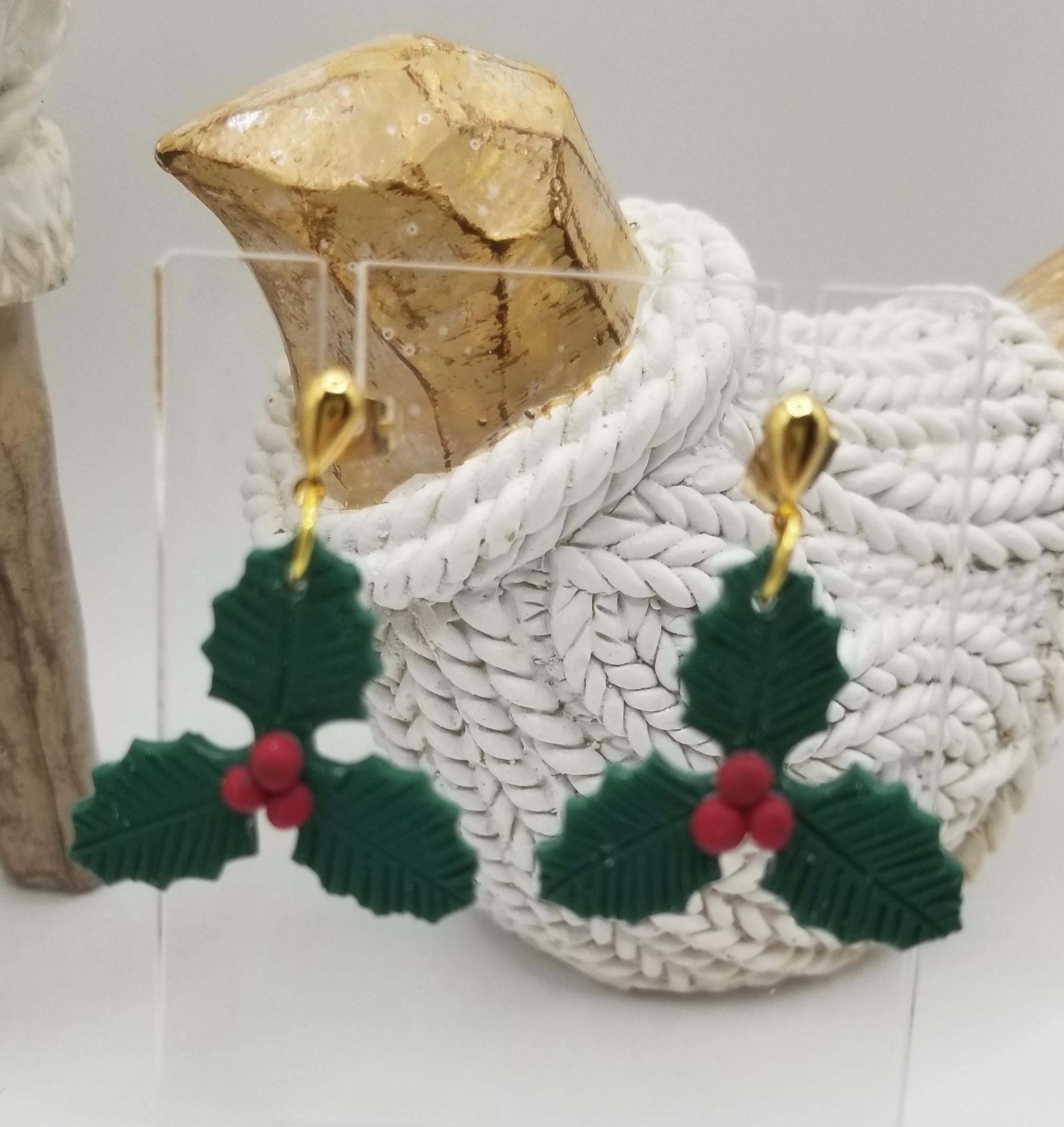 Lightweight polymer clay holly leaves and berries on 18k gold plated studs