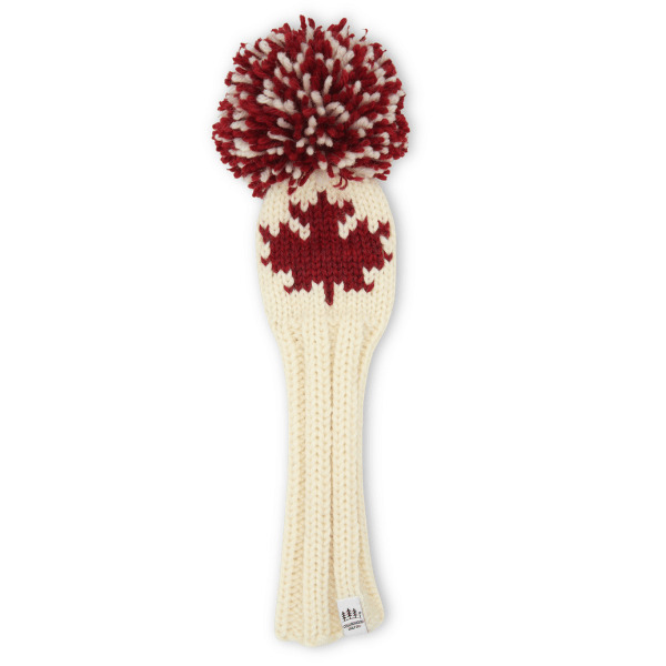100% wool, handmade knit headcover with a maple leaf motif. Fairway wood size. White + cherry red colourway.