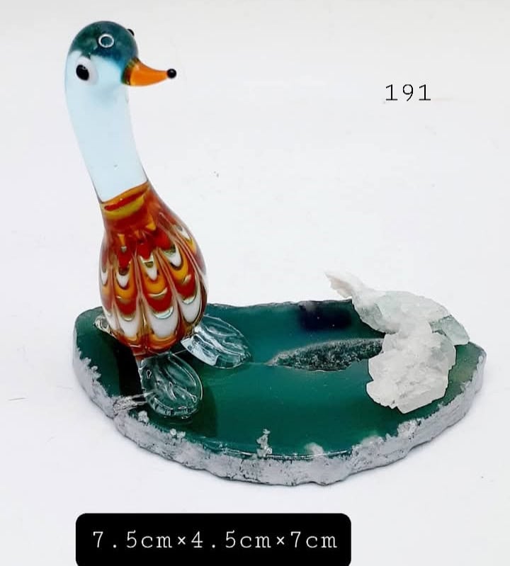 Light Blue Duck On Dyed Green Agate Stone Slice With Halite/White Fluorite Crystal(U.V) Accents.