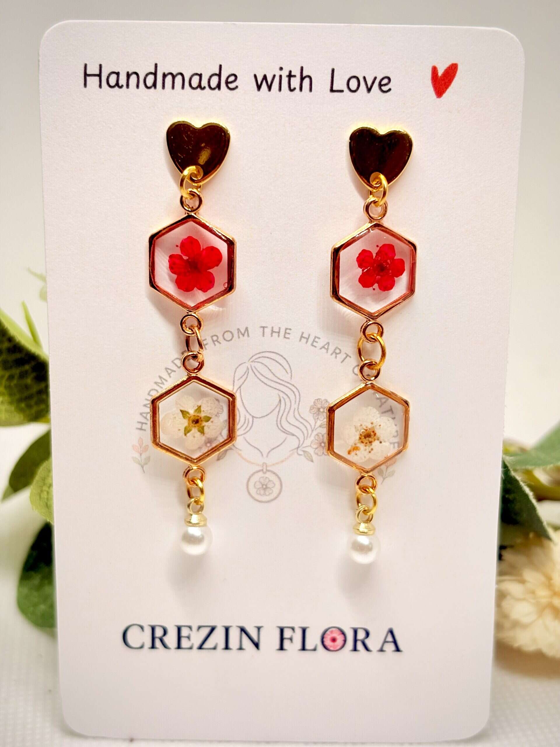White,red plum flowers pressed round hoop earrings, stainless steel post