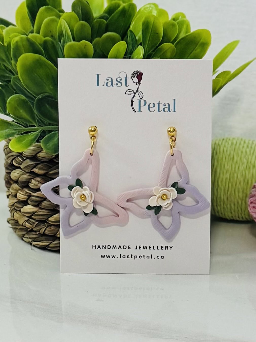 Pink and purple ombre butterfly dangles with flower detail on a gold ball post