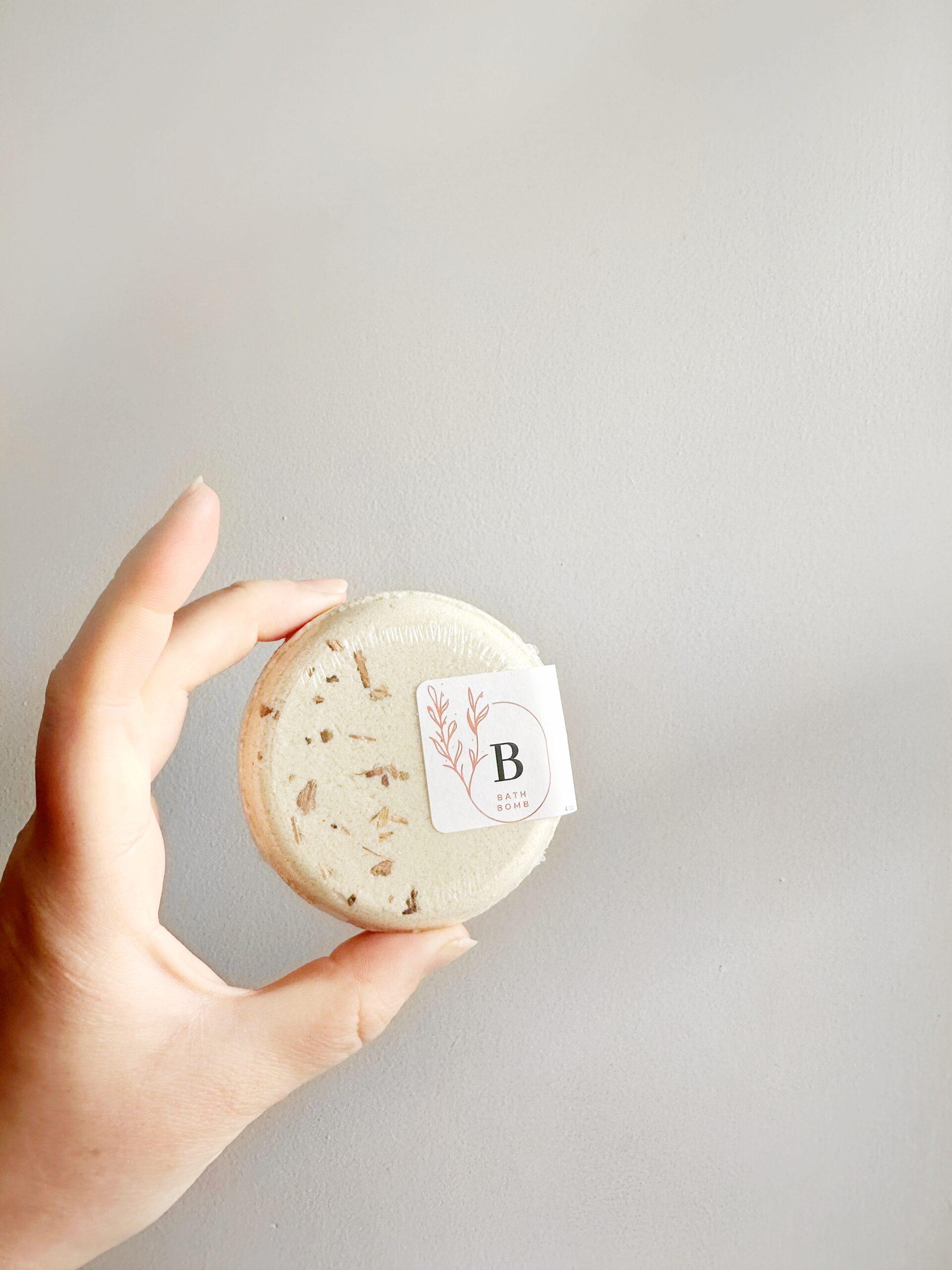 Ingredients: Baking Soda, Citric Acid, Epsom Salts, Corn Starch, Organic Coconut oil, witch hazel organic & Therapeutic Grade Essential oils. Tinted with Clay & adorned botanicals