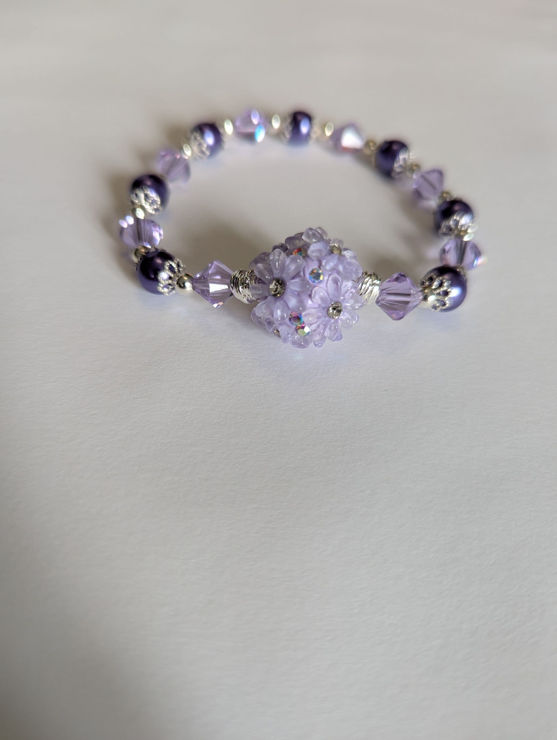 The Purple Daisy Stretch Bracelet is made of glass pearls, crystal bicones and filigree bead caps.