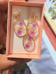 Real flowers jewelry set, earrings and necklace, 14k gold filled chain, stainless steel , purple plum and Queen Anne flowers