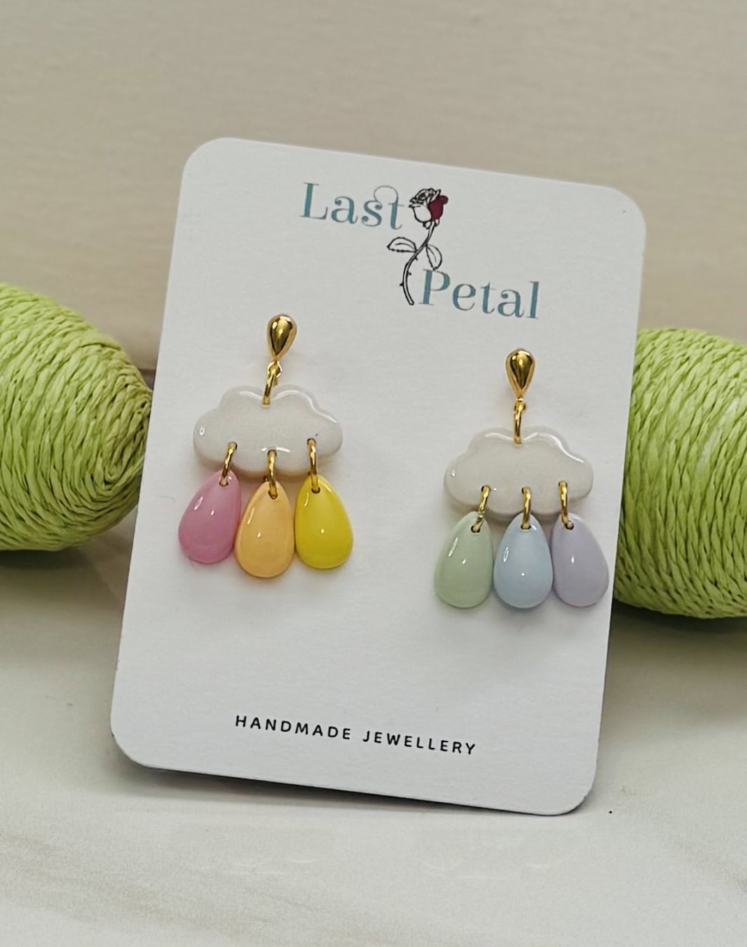rainbow cloud earrings with rainbow raindrops on a gold huggie hoop