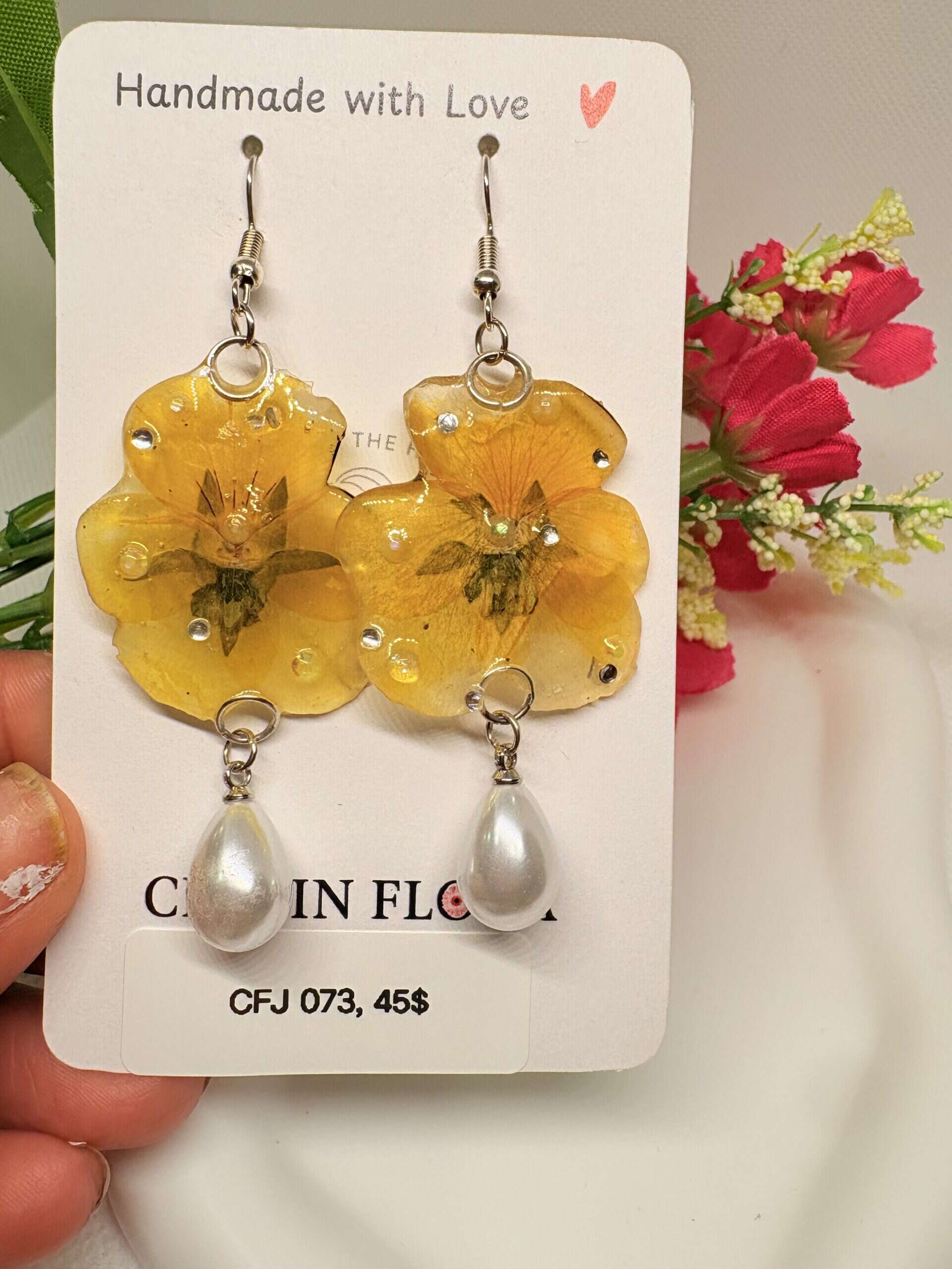Real dried whole yellow pensies as earrings with faux pearls