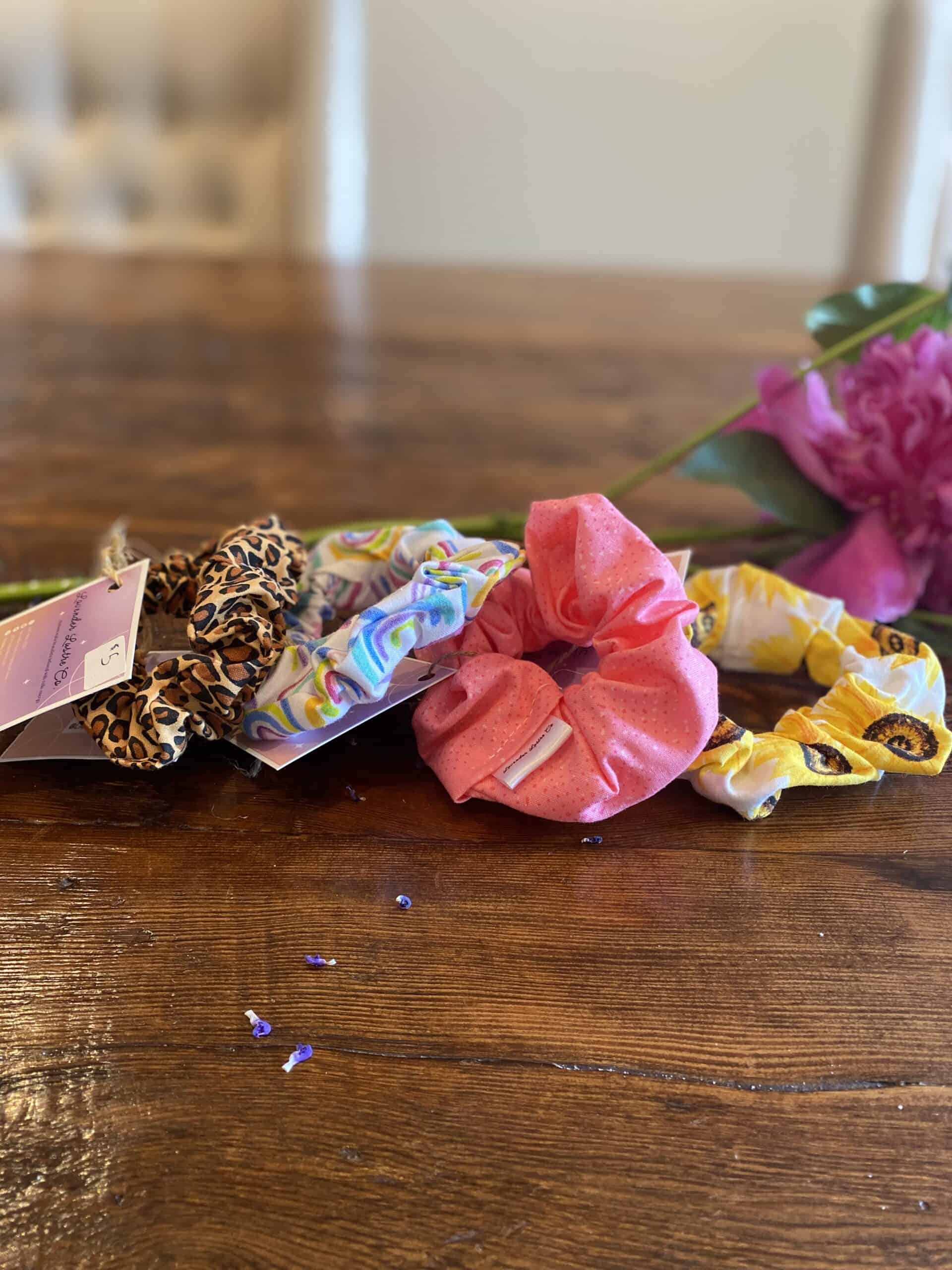 Fun print regular-sized scrunchies for all your messy bun needs.