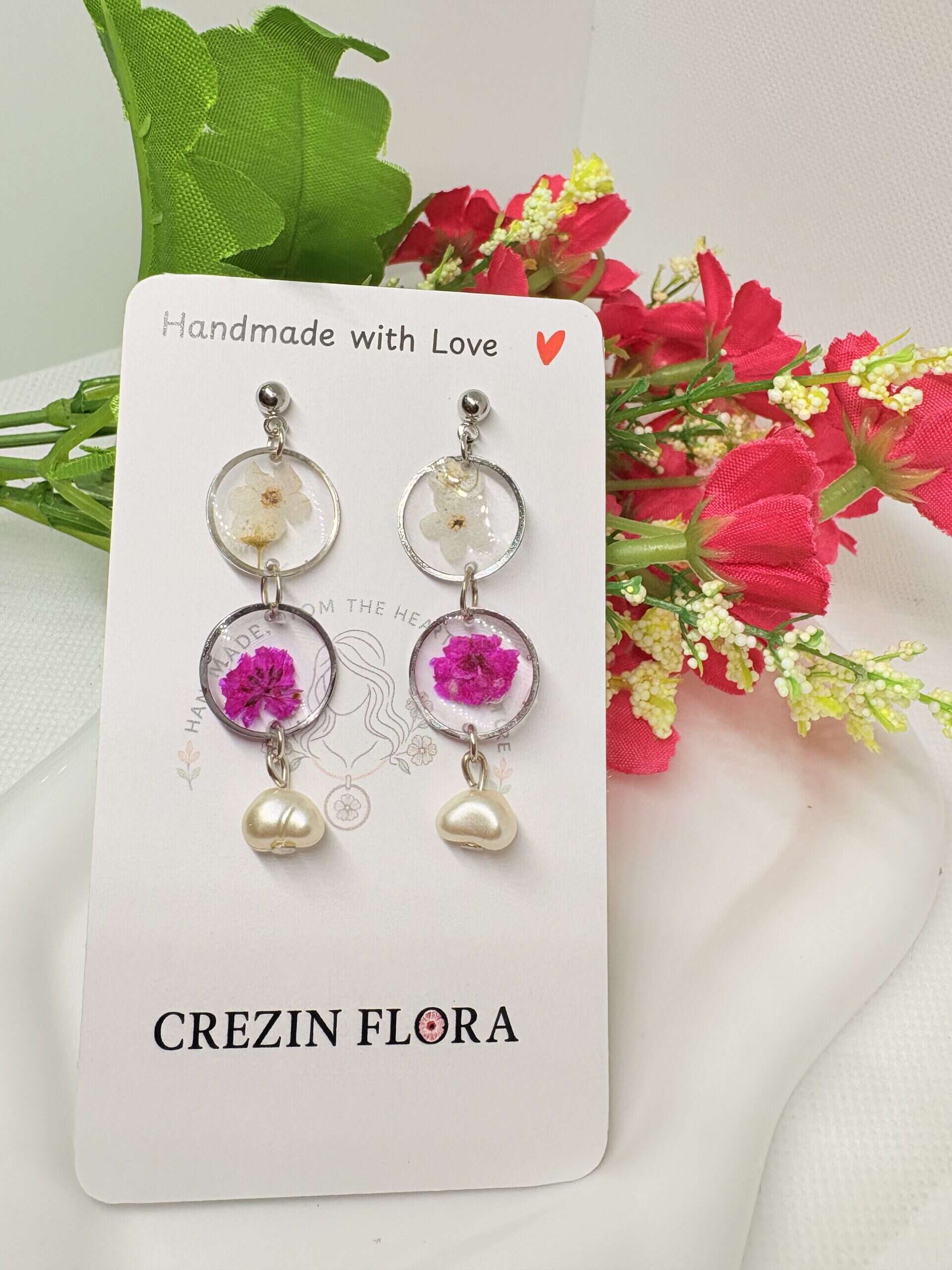 White , pink real flowers pressed round hoop earrings, stainless steel post
