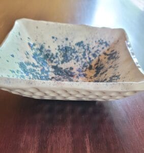 Small white dimpled bowl with specks of colour on the surface