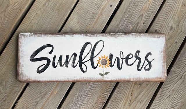 Sunflowers sign – rough script with flower stalk ‘O’ – 21″w x 7″h
