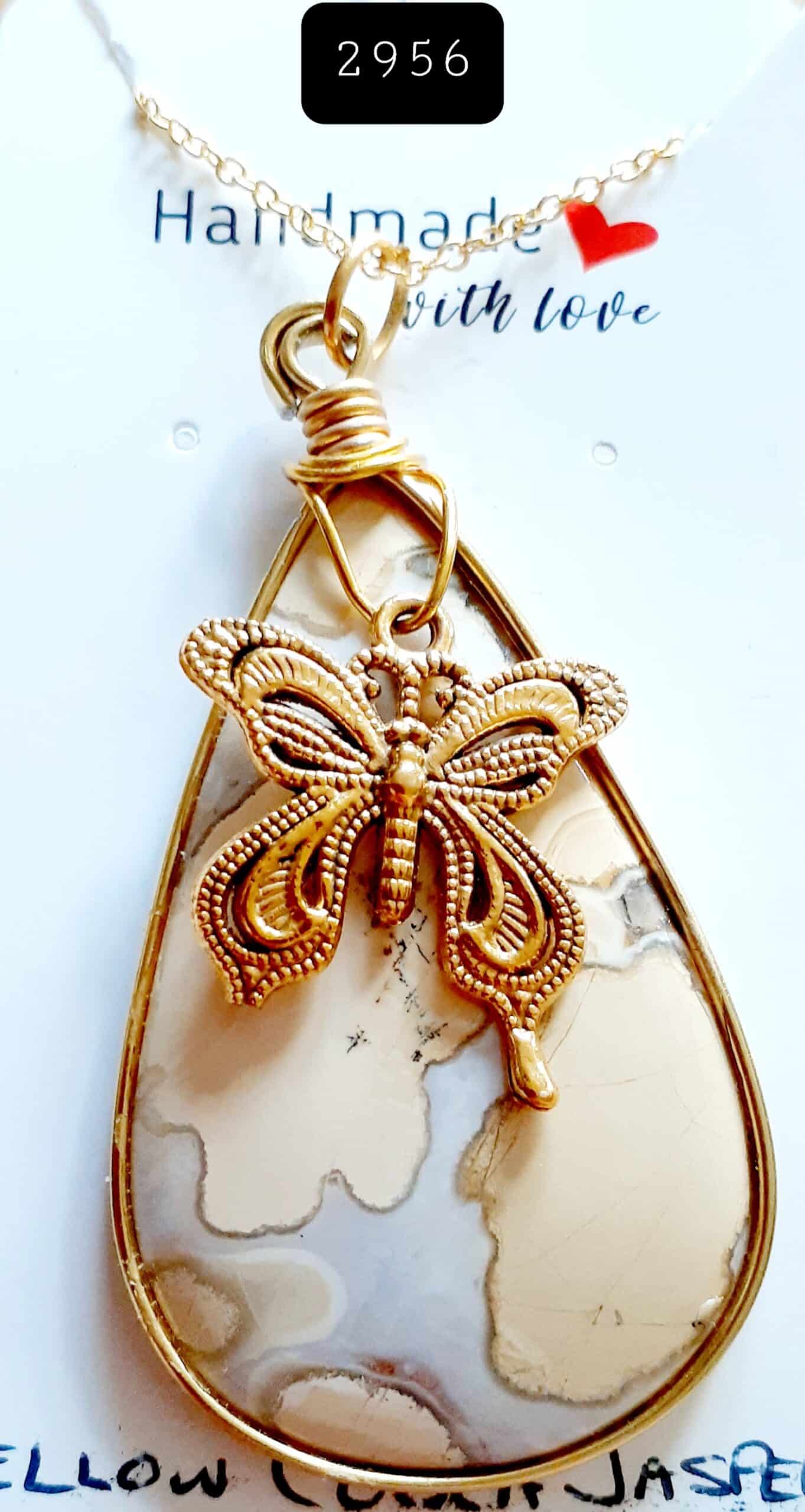 Teardrop Yellow Cobra Jasper Stone Gold Modern Edge Pendant Necklace with Butterfly