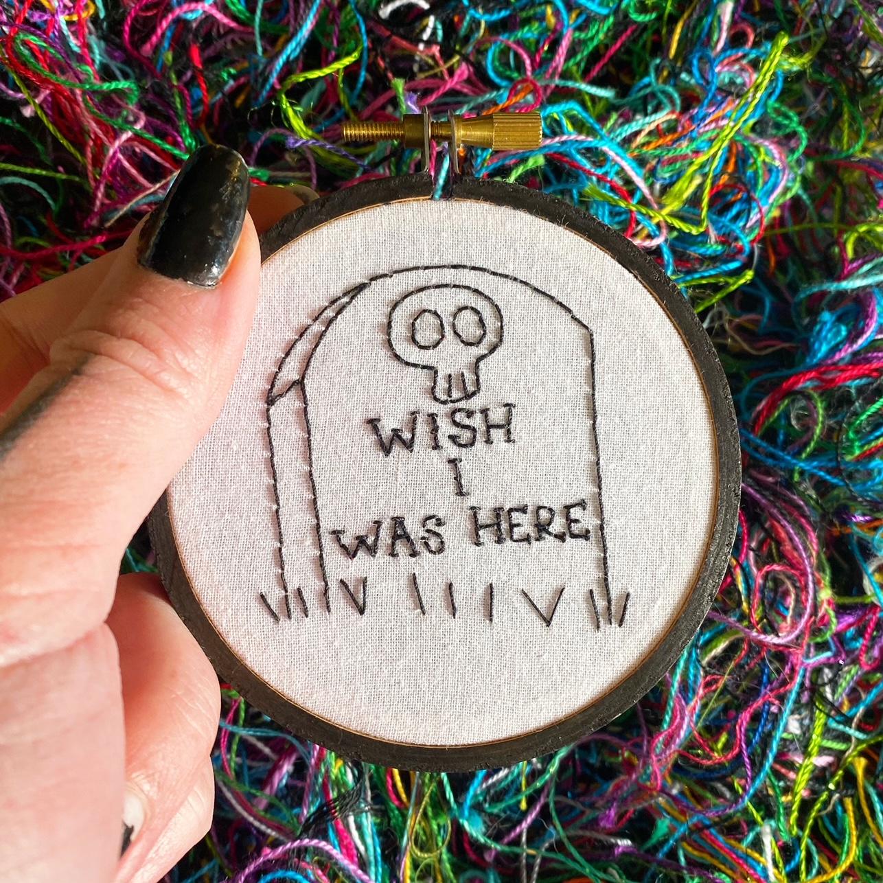 Tiny Tombstone Wish I Was Here 3″ Hand Embroidered Hoop Art