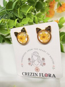 Stainless steel,mini cat shaped yellow real flowers present studs, yellow plum and queen annes